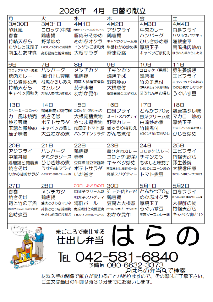 日替わり献立 2026.03.23 2021.01.02 消費税込み 2026-04献立ダウンロード 2026-03献立ダウンロード 2026-02献立ダウンロード 2026-01献立ダウンロード 2025-12献立ダウンロード 2025-11献立ダウンロード 2025-10献立ダウンロード 2025-09献立ダウンロード 2025-08献立ダウンロード 2025-07献立ダウンロード 2025-06献立ダウンロード